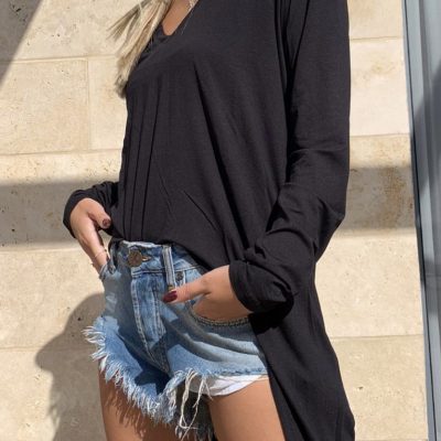 חולצת בייסיק פשתן צווארון v קרעים בסיומת